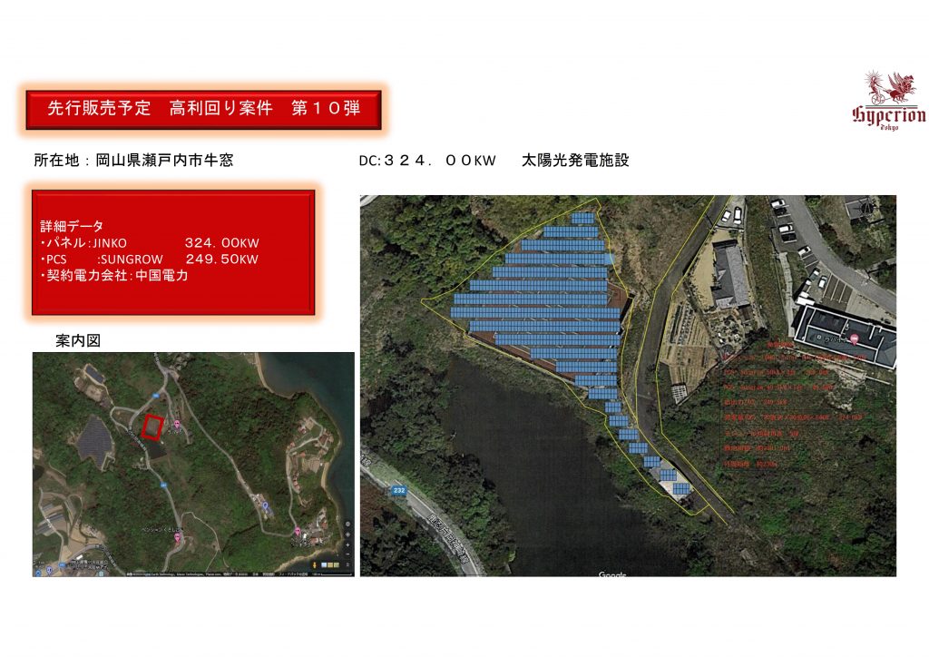 再生可能エネルギー 先行販売予定 高利回り案件 第10弾 2021.01.22 所在地:岡山県瀬戸内市牛窓(324.00kW) 詳細データ パネル(JINKO):324.00kW PCS(SUNGROW):249.5kW 契約電力会社:中国電力 先行販売予定 高利回り案件 第9弾 鹿児島県南さつま市案件 売電開始