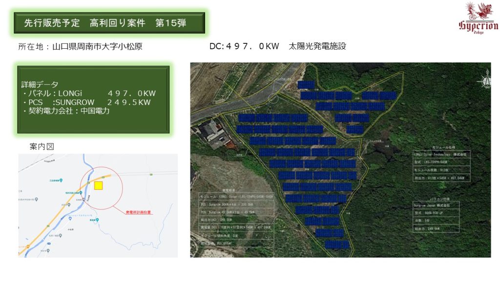 再生可能エネルギー 先行販売予定 高利回り案件 第15弾 2023.01.24 所在地:山口県周南市大字小松原(497.0kW) 詳細データ パネル(LONGi):497.0kW PCS(SUNGROW):249.5kW 契約電力会社:中国電力 年末年始休業のお知らせ Vue Aston 販売開始 in カンボジア