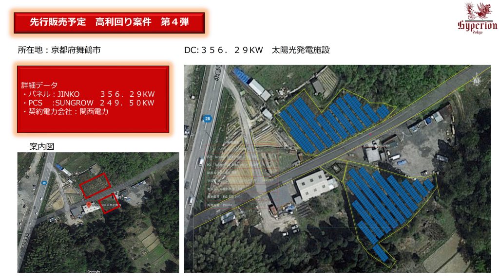 再生可能エネルギー 先行販売予定 高利回り案件 第4弾 2020.09.24 所在地:京都府舞鶴市(356.29kW) 詳細データ パネル(JINKO):356.29kW PCS(SUNGROW):249.5kW 契約電力会社:関西電力 先行販売予定 高利回り案件 第3弾 先行販売予定 高利回り案件 第5弾